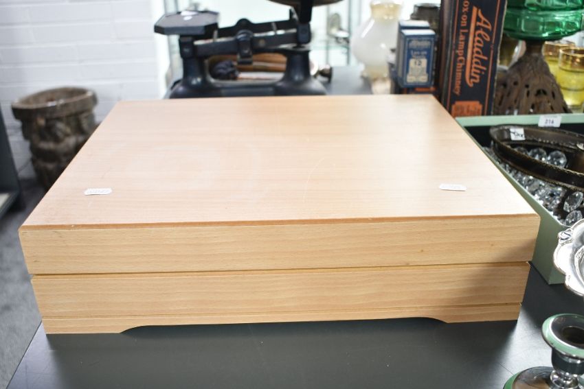 A 20th-century Cooper Ludlam of Sheffield wooden cutlery canteen, to include knives, forks, and spoons, all marked, (approximately 68 pieces), condition is consistent with age and use, having visible areas of surface wear to all, visible surface wear, interior chips and residue to presentation canteen also, all sold as seen.
