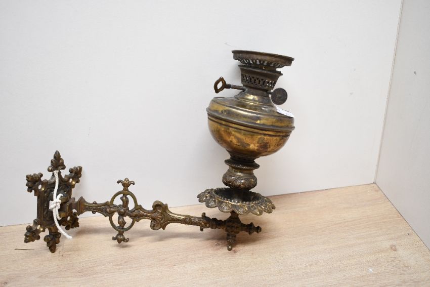 Two late 19th to early 20th-century brass Loki 'Number 3' wall-mounted oil lamp, featuring a decorative floral-shaped finial with ornate scrolled and foliate metalwork to the arms and mounting plates, marked, 20cm from wall mount to end of arm and 18cm in length upwards from the end of arm to top of oil lamp, condition is consistent with age and use, visible areas of surface wear to all, with surface scratches visible, sold as seen.