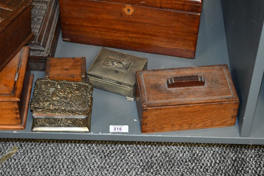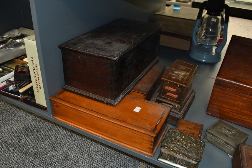 A selection of late 19th to 20th-century wooden boxes, to feature a Tallent of Old Bond Street music box with shield decoration; a large mahogany letter rack, featuring a hinged lid and inlaid escutcheon; a hand carved Indian box having the Taj Mahal atop and more, all unmarked, (10), condition is consistent with age and use, having visible areas of wood wear and surface wear, some are locked with no keys or hinge has broken, sold as seen.