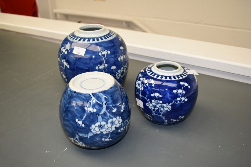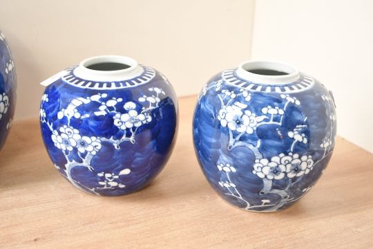 Three 19th to early 20th-century Chinese blue and white porcelain graduated ginger jars, of ovoid-form, having hand painted prunus decoration, no character mark to base but all with a singular circle to each, (3).