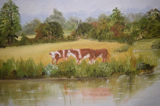 C. Balkham (20th Century) Oil on board 'Quiet Waters - Kent', a pastoral river scene with cattle, signed lower left, attributed and entitled verso, within moulded frame, 33.5cm x 24cm & 43cm x 33cm overall.