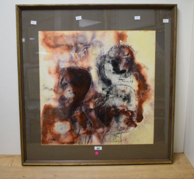 Rafael Wachash (Israeli b. 1941) Mixed media, a portrait study capturing three heads in a rust colour palette, signed and dated (1967) lower left, within card mount and moulded gilt frame, under glass 55cm x 55cm & 75cm x 77cm overall.