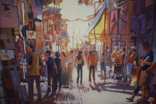 Annette Kane (Contemporary) Oil on canvas, a vibrant Eastern market scene in warm tones, signed verso, within wooden tray frame, 88cm x 74cm & 93cm x 79cm overall.