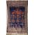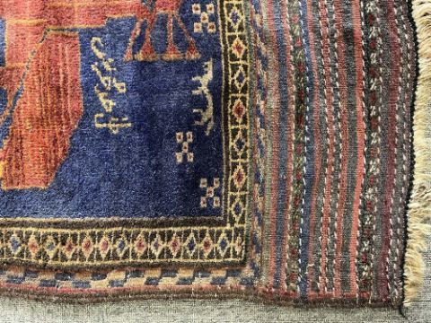 A vintage knotted Afghan prayer rug featuring an eagle and feathers motif, in rich red and navy, measures 34 x 55 inches.