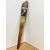 An antique treen corset stay, originating in Stockholm, hand painted to depict a red rose and a lady in traditional dress, with red hat and apron, yellow scarf and brown dress, sat on a green chair before a window in a wood panelled room or cabin, has slight historical damage to the upper corner and edge of the wood, some wear to the paint, measures 2 x 18 inches overall.