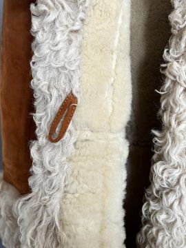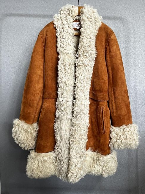 A circa 1960-70s Afghan coat in 100% lambskin shearling, having a orange-tan suede outer with collars, cuffs and hems lined in curly, soft and thick blonde sheep fur, with cream shearling lining, hip pockets and waist detail, lovely condition, size L.