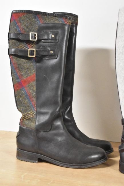 Two pairs of ladies wool panelled riding or country boots with and buckle details and zip closures, to include a Hunter 1856 model in dark brown leather featuring a moss green, red and blue tartan, size 40, light signs of wear, along with another pair of pale grey marl panelled boots having dark brown rubber uppers, size 41, unworn.