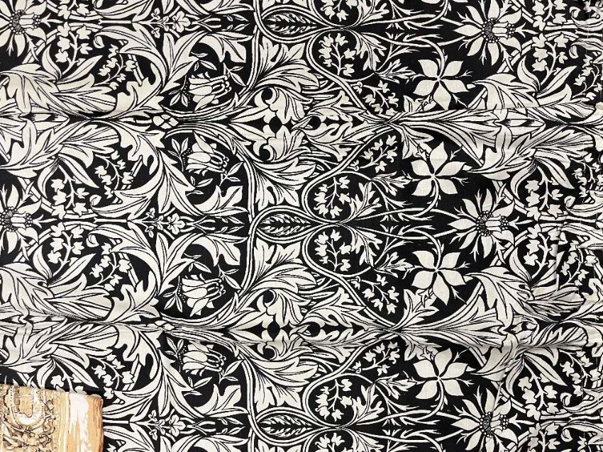 Vintage William Morris pencil pleat curtains in Brother Rabbit pattern in black and cream, each measure 42 x 92 inches approximately, has some discolouration spots and a tear. Along with a length of vintage fabric in the style of John Piper measuring 100 x 100 inches approximately, along with two green fringed rope curtain ties.