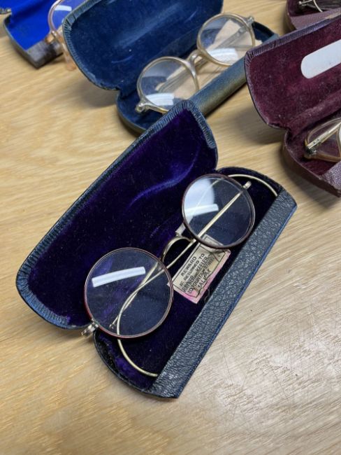 Assorted 19th century pairs of spectacles contained in glasses cases to include cat eye and wire framed styles, in textured leather and perspex cases.