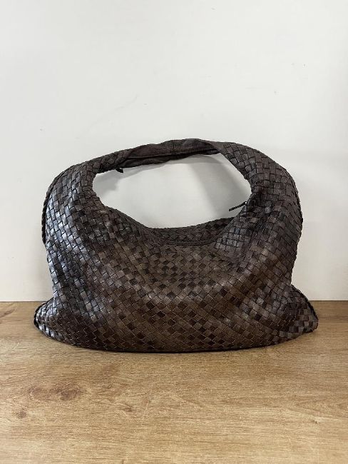 A "Bottega Veneta" woven hobo bag in chocolate brown leather, white metal hardware, camel suedette interior lining, embossed inner leather label, measures W 18.5 x H 12.5 inches, no serial number found therefore not verified.