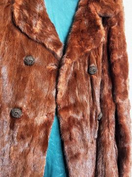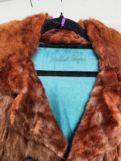 Two early 20th century fur coats, comprising a Richard Payne 3/4 length rust red squirrel hide coat with notched lapels and knotted buttons, with striking emerald teal satin lining, size Small, and a Springs of Blackpool short jacket in blonde 'mink' fur, with light taupe rose patterned lining, size Medium.