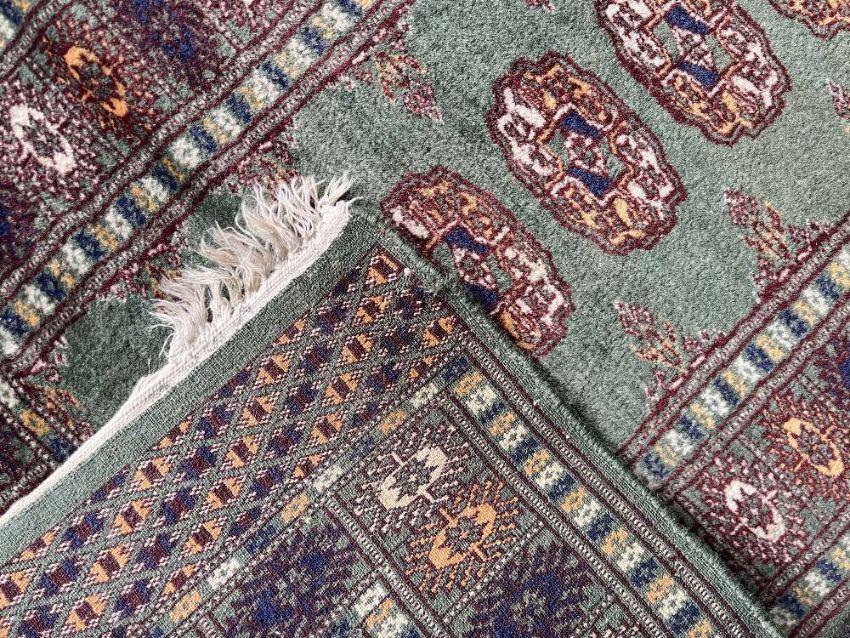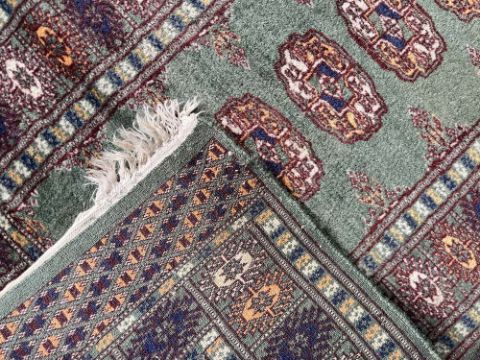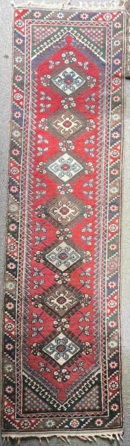 Two hand knotted wool rugs; comprising a Turkish runner rug having a repeat diamons gul design along the centre, with floral adornments, gemoetric and foliate borders, in green, turquoise, brown and cream on a red ground, measures 116 x 31 inches approx, along with a small area rug of similar description, in soft green and yellow colour way, measures 25 x 36 inches.