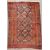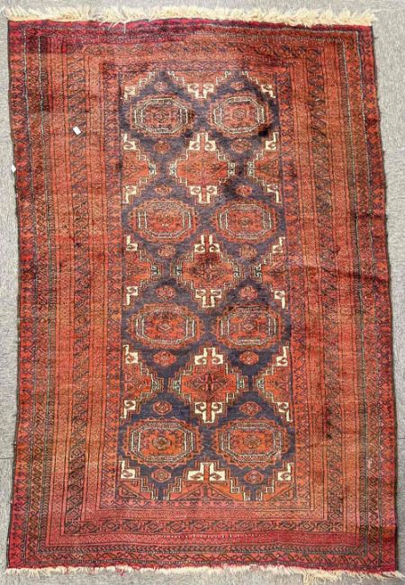 A Persian area rug in red wool with cream and brown accents, having a central tiled diamond gul design, with multiple borders and tasselled edge, measures 49 x 75 inches approximately.