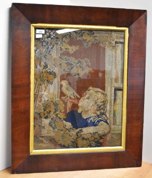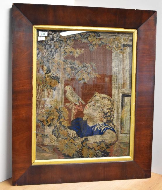 A Victorian woolwork tapestry in Mahogany frame, depicts a girl and bird at a window with fruit tree, in rich brown, blue and greens, measures 24 x 29 inches overall.