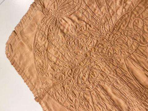 A pair of 20th century vintage Trapunto quilted cushion covers in blush terracotta crepe, depicting ornamental flower arrangement in bud vase with bows, having pleated frill edging, each measuring 21 x 21 inches.
