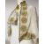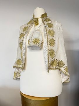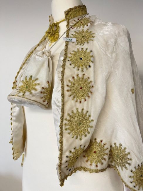 A vintage white velvet cape and matching drawstring purse, both adorned with embroidered gold sun medallion motifs.