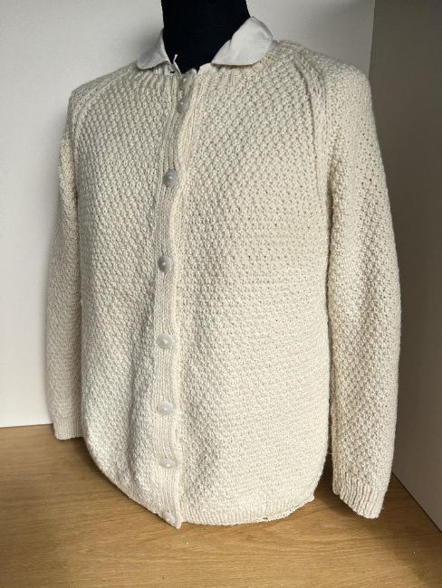 Three 1980s vintage garments to include a Laura Ashley cream silk pintuck blouse, cream handknitted Arran wool cardigan, and an openwork beige waistcoat in ecru cotton.