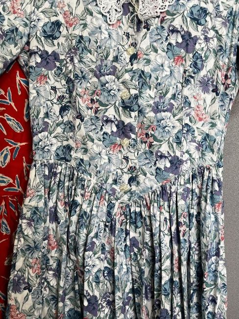Five 20th century vintage button-down floral tea dresses to include two Vivien Smith examples in deep purple ditsy print and another lighter lilac and blue with crochet collar, along with three unlabelled scoop neck examples in shades of red and pink.