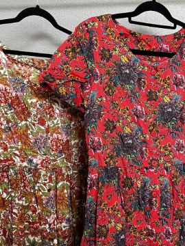 No size labels, Vivien Smith dresses measure a 28 inch (purple) and 26 inch (white floral) waist, the three others are "over sized" or loose fitting styles with approximately 32 inch waists, to fit M-L.