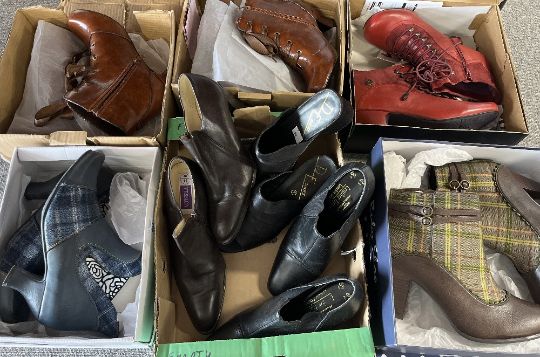 A quantity of ankle boots to unclude three pairs of low heeled Joe Browns, Hush Puppies, Ruby Shoo and Laura Vita brand shoe boots and ankle boots, in tan, red, teal, green and brown with lace up, buckle, suede effect and tartan detailing, sizes 41 / UK7, Three pairs in maroon tartan and synthetic leather, two Chelsea boot style and one lace up, all size 40, Three pairs of 1990s heels; D E Shoes slingback mules in black matte satin, with a block heel,size 7, and two pairs of 1990s leather heeled shoe-boots, a black St Michael size 6.5, and a dark brown Yessica size 6.5.