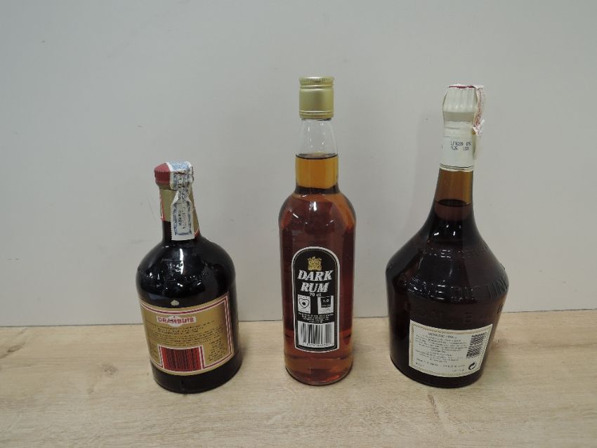 Mixed Spirits, Drambuie with import label intact, 40% vol, 0.75lts, DOM Beneditine with import label intact, 40% vol, 1 Litre, Tesco Dark Rum, 37.5% vol, 70cl, all mid neck levels, (3)