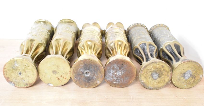 Three pairs of French World War I brass trench art shell cases, one pair with shaped rim and embossed stylised cross of Lorraine, the remaining two pairs with foliate designs, all over compressed fluted bases, tallest 34cm