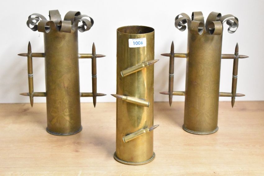 A near pair of French World War I 75Dec trench art shell cases, each with scrolled crowns over bodies finely hand-engraved with foliate designs and applied 'bullet' handles, each marked 75DEC to base, one with H100L.15 USA, 27cm sold along with a German brass shell case with engraved initials and three applied bullet ornaments, various markings to base including 1906, 28cm