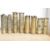 Four pairs of French and British brass World War I trench art shell cases, each with shaped decorated rims and embossed decoration, one with parachute and bell flower motif and marked Souvenir and Charles Heloise, 33cm