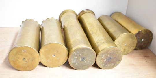 A near pair of unusual French brass 75DEC World War II trench art shell cases, decorated with Japanese figural scenes with Japanese characters/script within stylised borders, 34cm sold along with a pair of World War I period German trech art shell cases, engraved with 1914 Souvenir De La Bataille Du Catuau 1918 and with shaped decorative rim, 23cm and two other engraved German trench art vases. 23cm