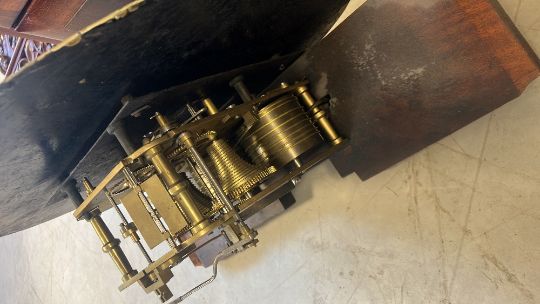 A 19th Century mahogany cased wall clock of large proportions, having double fusee movement , and painted dial with Roman numerals, and named for W W Kent, Manchester approx. Height 160cm