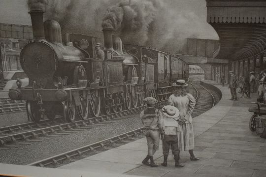 John S Gibb (British 20th Century) Lithograph 'Lancaster L.N.W.R 1903', a monochromatic railway study, signed in pencil to lower right margin and numbered (95/850) lower left, within stepped card mount and moulded wooden frame, under glass 51.5cm x 36.5cm & 68cm x 53cm overall. Sold alongside a second print by the same artist.