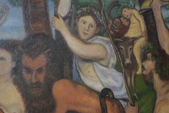 After Titian (Italian 1488/90 - 1576) Oil on canvas 'Bacchus and Ariadne' a 20th Century reproduction, attributed to 'J.B Cann?' verso, unframed, 182cm x 152cm overall.