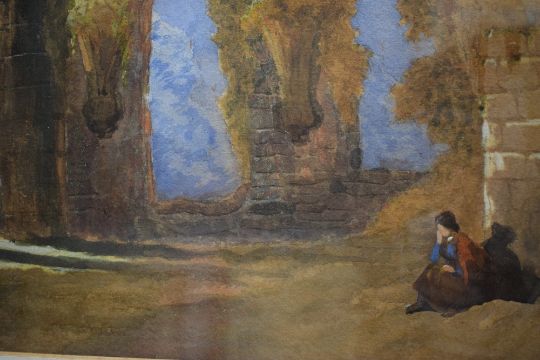 A 20th Century watercolour, a figure seated in contemplation beneath architectural ruins, unsigned or attributed, within card mount and moulded gilt frame, under glass 45cm x 28cm & 67.5cm x 51cm overall.