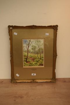 J Hamilton (19th/20th Century) Watercolour 'Primrose Meadow', a blooming springtime woodland, signed lower right, entitled and attributed with location 'NR. Halesowen, Worcs' to mount, within stepped gilt mount and moulded gilt frame, under glass 17cm x 23cm & 40cm x 50cm overall.