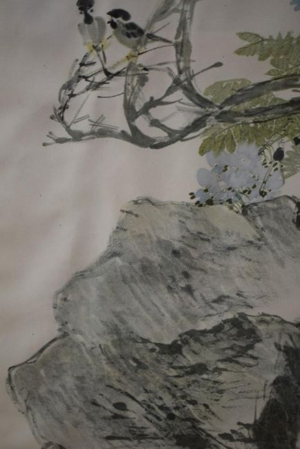 A 20th Century Chinese panel inspired lithograph, depicting small birds on a tree branch, within card mount and gilt frame, under glass 23.5cm x 43.5cm & 34.5cm x 57cm overall.